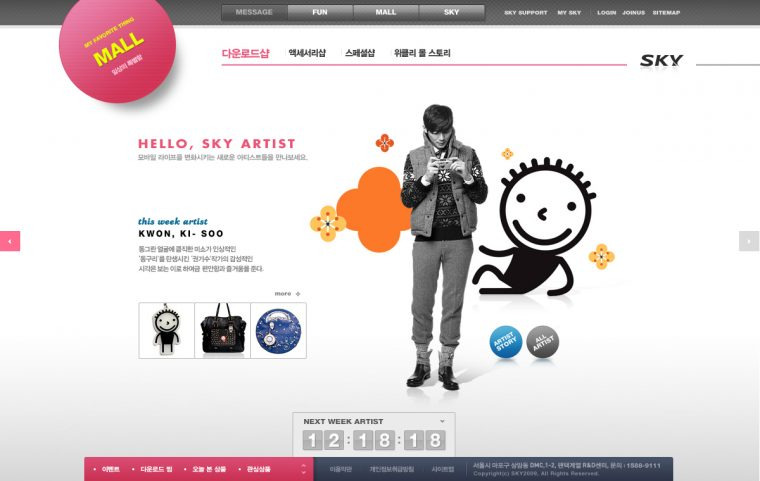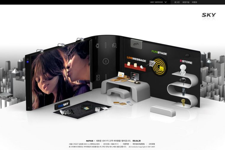 01지금은 사라진 팬택의 휴대폰 브랜드 SKY의 브랜드 사이트, isky.co.kr. 프리미엄 휴대폰 브랜드에 걸맞는 '프리미엄 팝 콘텐츠 & 서비스 기반의 전면 개편'을 ㈜그라비티인터랙티브에서 제안해 수주했다. 최선을 다한 주축 인력들이 개편 직후 회사를 떠나면서, 2010년 잠시 운영을 맡았다. 크게, <The 스카이>, <Live 메시지>, <Fun 스테이지>, <It 스토어> 4개 메뉴로 구성되어 있었는데, <Live 메시지>와 <It 스토어>를 담당했다.